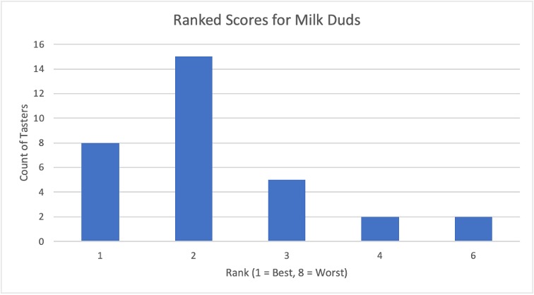 By far the most preferred candy in this set were the Milk Duds. Far from a dud, 72% of participants ranked these caramel & chocolate treats as their #1 or #2 pick of the set.