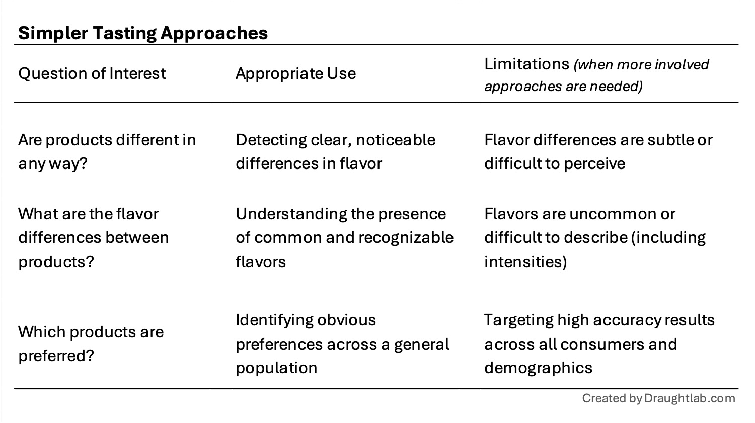 Not every question requires complicated methods or highly trained tasters. In many cases, especially when directional insights are sufficient, simple tasting approaches can provide fast, actionable feedback. These methods are best suited for addressing high-level questions about differences, flavor character, and broad preferences, but they also come with important limitations.